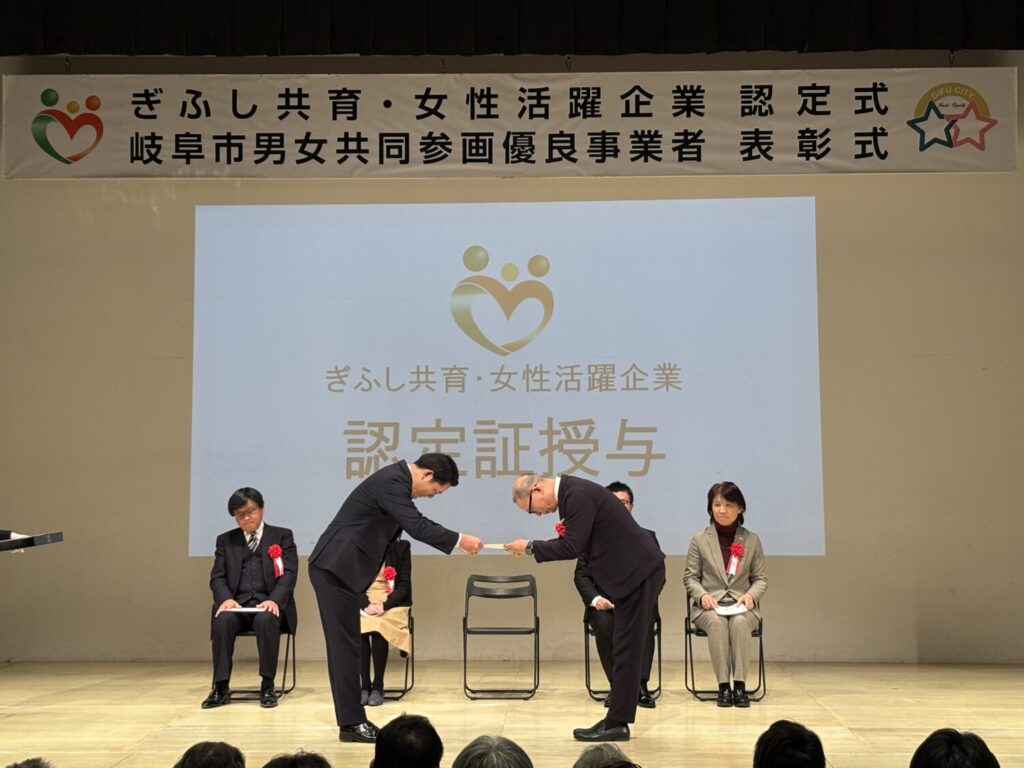 岐阜市が推進する「ぎふし共育・女性活躍企業認定」の更新を完了し、2026年2月6日に開催された認定式において、柴橋市長より認定証が授与されました。